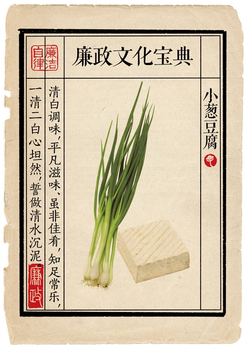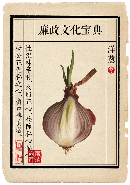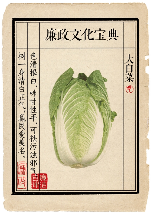 说明:用象征寓意的手法将色清根白大白菜、不藏私心的洋葱、一清二白的小葱豆腐为基点,传达廉政文化内涵,为官就要像大白菜、洋葱、小葱豆腐那样。